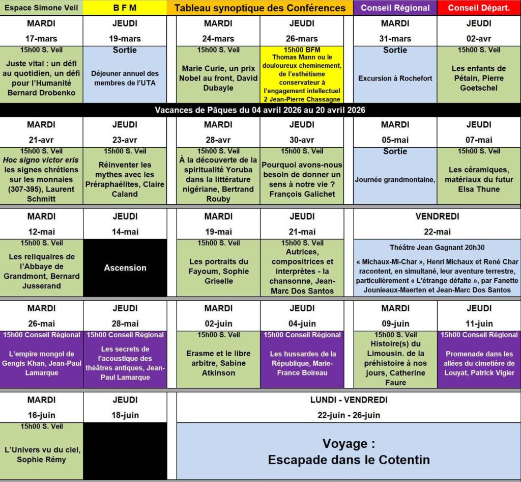 Conférence surlignée en jaune : Auditorium Clancier, BFM. Limoges.